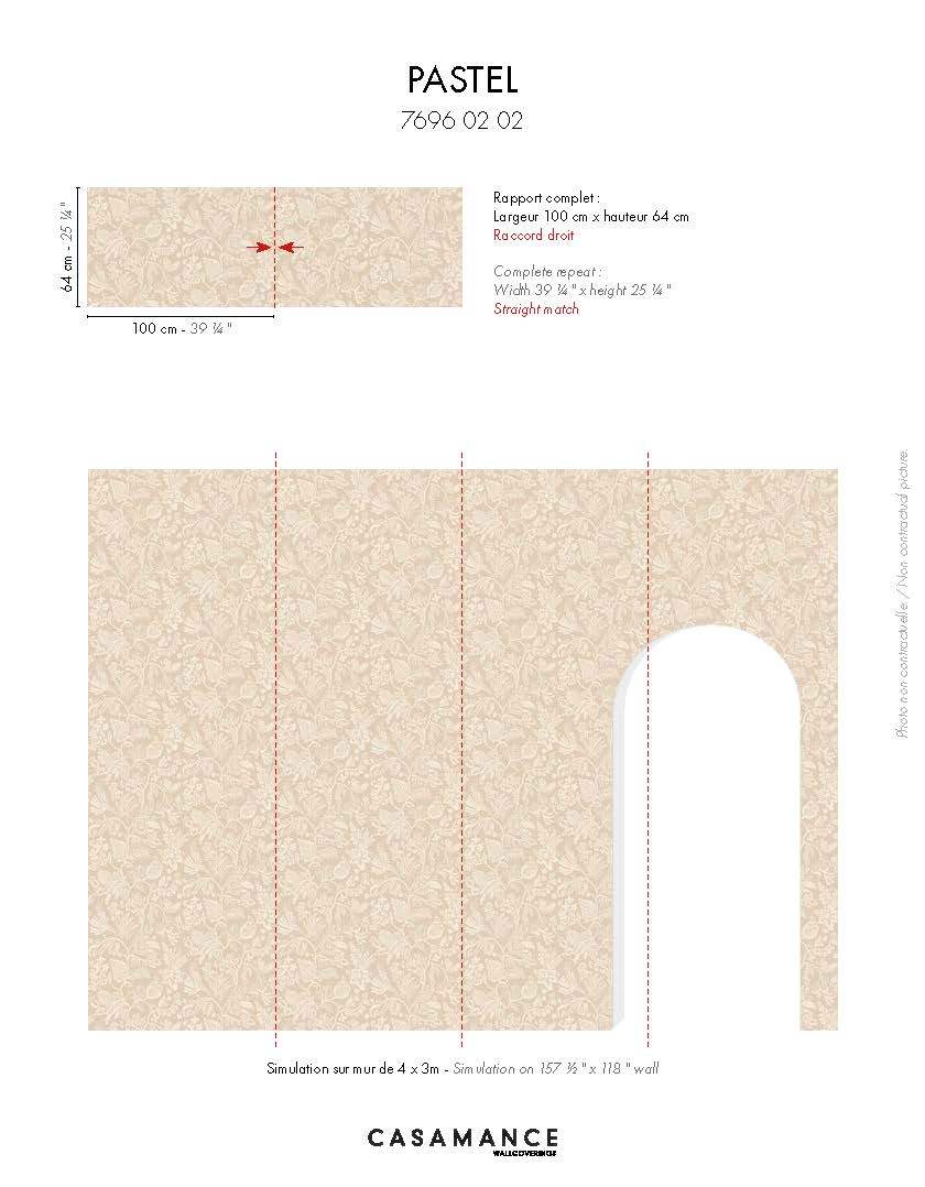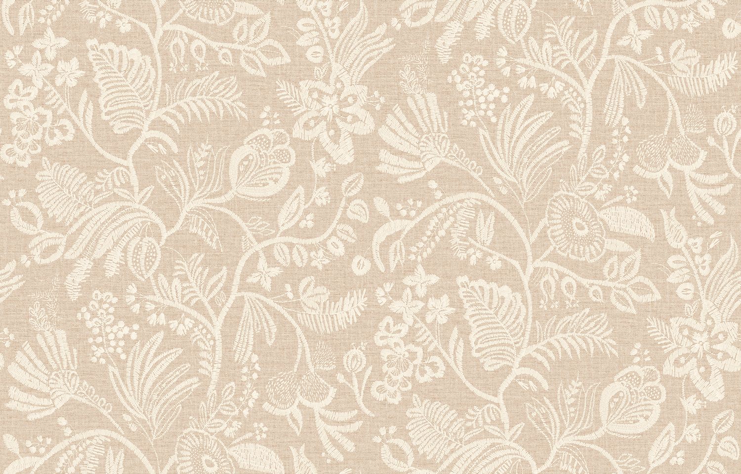 This texture suggests a soft embroidery inspired by Pastel flower meadows, grown for their sought-after pigment used in textile dyeing. Replicated on an extra-wide vinyl wallcovering, these embroidered flowers come in a palette of soft, neutral shades. Nude, terracotta and emerald complete the range.