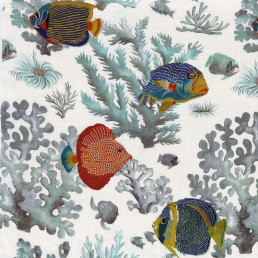 Majesties in their kingdom of seaweed and coral, they illuminate the seabed with their dazzling colours. On a linen fabric, the coral reefs are recreated using digital printing and welcome these sumptuously embroidered fish. The Regal Angelfish and Queenfish shine in the calm waters of the atolls and plunge us into an atmosphere of perfect serenity.