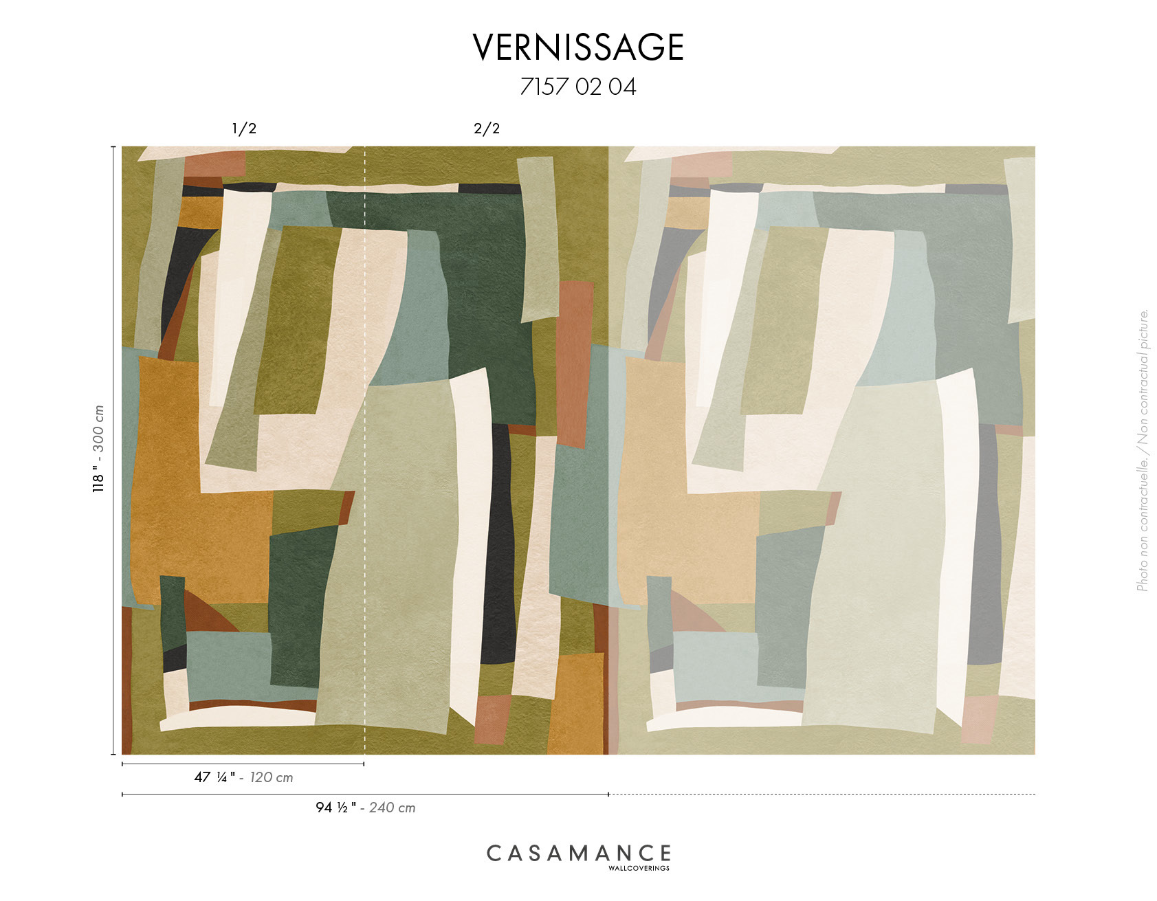 VERNISSAGE puise son inspiration dans une œuvre géométrique abstraite constituée de papiers colorés, froissés, découpés et associés avec poésie. Reproduit par impression digitale sur une base intissée froissée, il restitue l’intensité des teintes et l’esprit de la création originale. Composé de deux lés et raccordable à l’infini, ce panoramique est proposé en deux versions. L’une est réalisée dans une gamme de teintes naturelles, l’autre associe à l’ocre toute une palette de verts profonds.