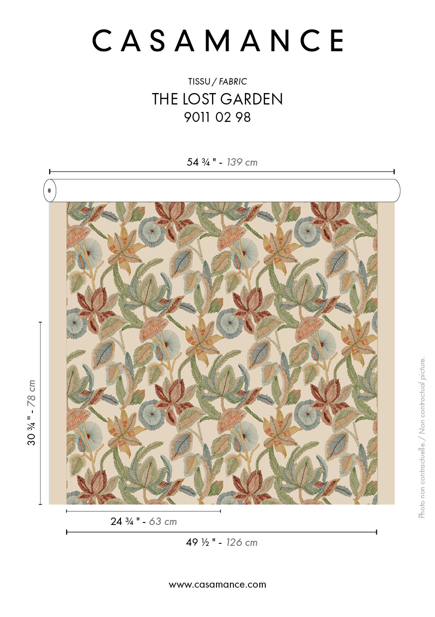THE LOST GARDEN est une composition florale, brodée sur une toile épaisse présentant l’aspect artisanal du lin brut.Les folioles découpées de l’acacia inspirent un point de broderie très présent dans la composition. Brodée au point lancé avec un fil de polyester mat sur une base de coton, lin et viscose, l’étoffe est proposée en deux versions de teintes. Elle se prête parfaitement à la confection de rideaux.